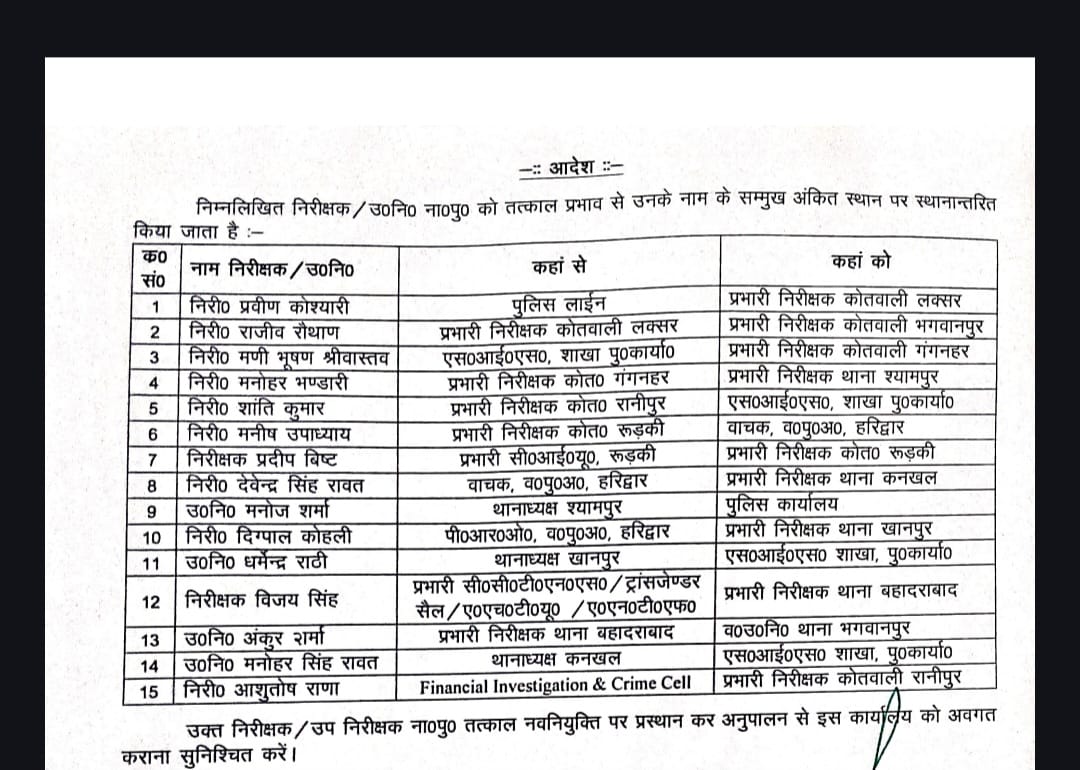 हरिद्वार। हरिद्वार पुलिस महकमे में महत्वपूर्ण प्रशासनिक फेरबदल हुआ है। वरिष्ठ पुलिस अधीक्षक (एसएसपी) हरिद्वार के आदेश पर 15 निरीक्षकों (इंस्पेक्टर) और उप-निरीक्षकों (सब-इंस्पेक्टर) का…
