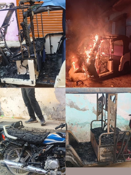 रावली महदूद में चार्जिंग के दौरान दो ई-रिक्शा जलकर राख, फायर ब्रिगेड नहीं पहुंची