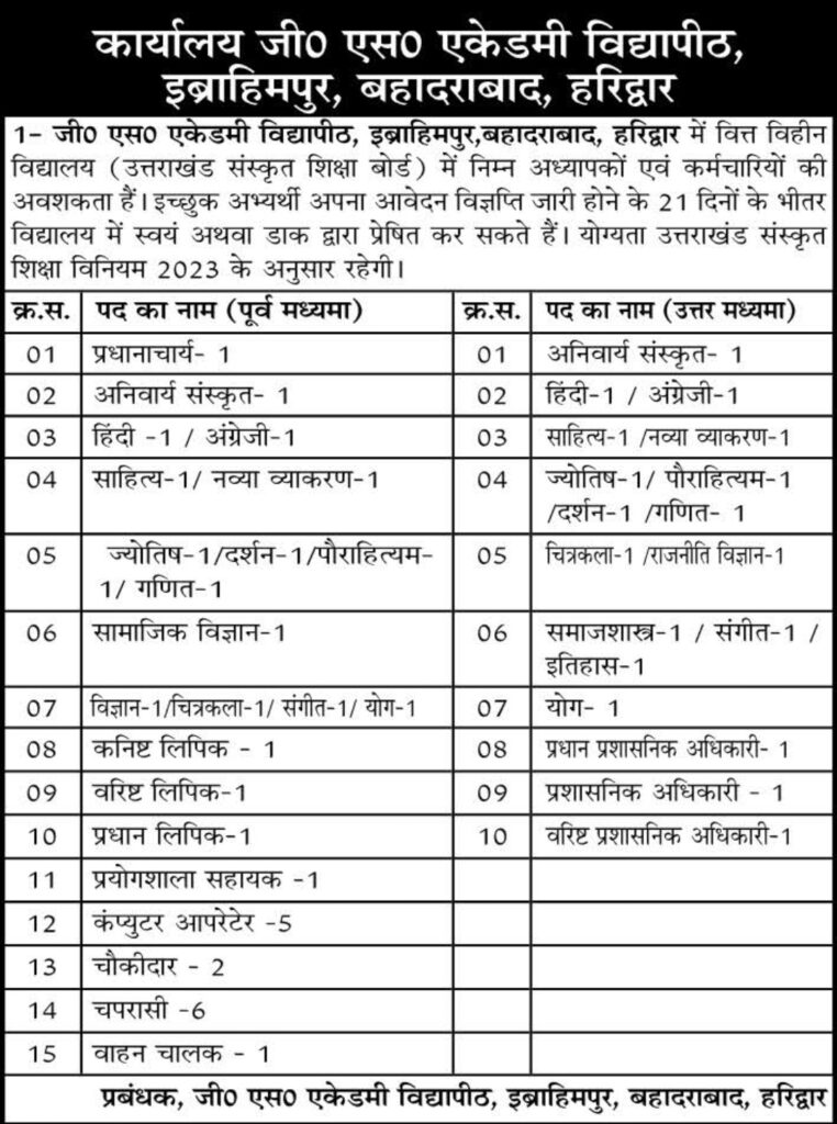 हरिद्वार (गौरव कुमार) पूर्व मध्यमा और उत्तर मध्यमा यानि कि हाई स्कूल और इंटरमीडिएट वित्त विहीन विद्यालय में प्रवक्ता से लेकर चपरासी तक के 40 से ज्यादा पदों पर आवेदन मांगे गए हैं। इसके लिए विद्यालय प्रबंधन की तरफ से विज्ञापन जारी किया है। इसमें आगामी 21 दिनों के भीतर कोई भी इच्छुक उम्मीदवार अपने तमाम दस्तावेजों के साथ विद्यालय में आवेदन पत्र जमा करा सकते हैं। जी.एस एकेडमी विद्यापीठ, इब्राहिमपुर बहादराबाद हरिद्वार के विद्यालय (उत्तराखंड संस्कृत शिक्षा बोर्ड) प्रबंधन के अनुसार यहां अध्यापकों और कर्मचारियों की आवश्यकता है।